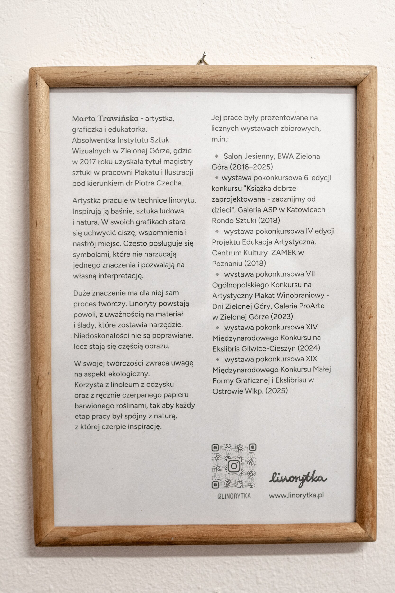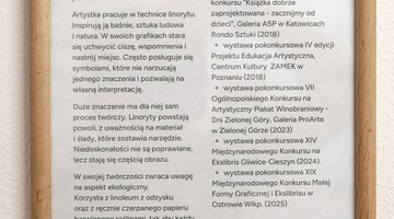 Marta Trawińska - Credo artystyczne Specjalizuje się w linorycie. Inspirują ją baśnie, sztuka folkowa i natura. W swoich grafikach stara się uchwycić ciszę, wspomnienia i atmosferę miejsc. Emocje i sensy często ukrywa w symbolach, które odsłaniają się dopiero przy dłuższym spojrzeniu. Proces twórczy jest dla niej równie ważny jak efekt końcowy. Jej prace powstają powoli. W rytmie, który narzuca sama materia. Niedoskonałości wynikające z cięć, świadomych lub zupełnie spontanicznych, stają się częścią opowieści i nadają grafikom niepowtarzalny charakter. Ważnym elementem jej twórczości jest także podejście ekologiczne. Do matryc wykorzystuje linoleum z odzysku, a odbitki wykonuje na własnym, ręcznie czerpanym papierze barwionym roślinami. Dzięki temu każdy etap pracy ma bezpośredni związek z naturą, z której czerpie inspirację.