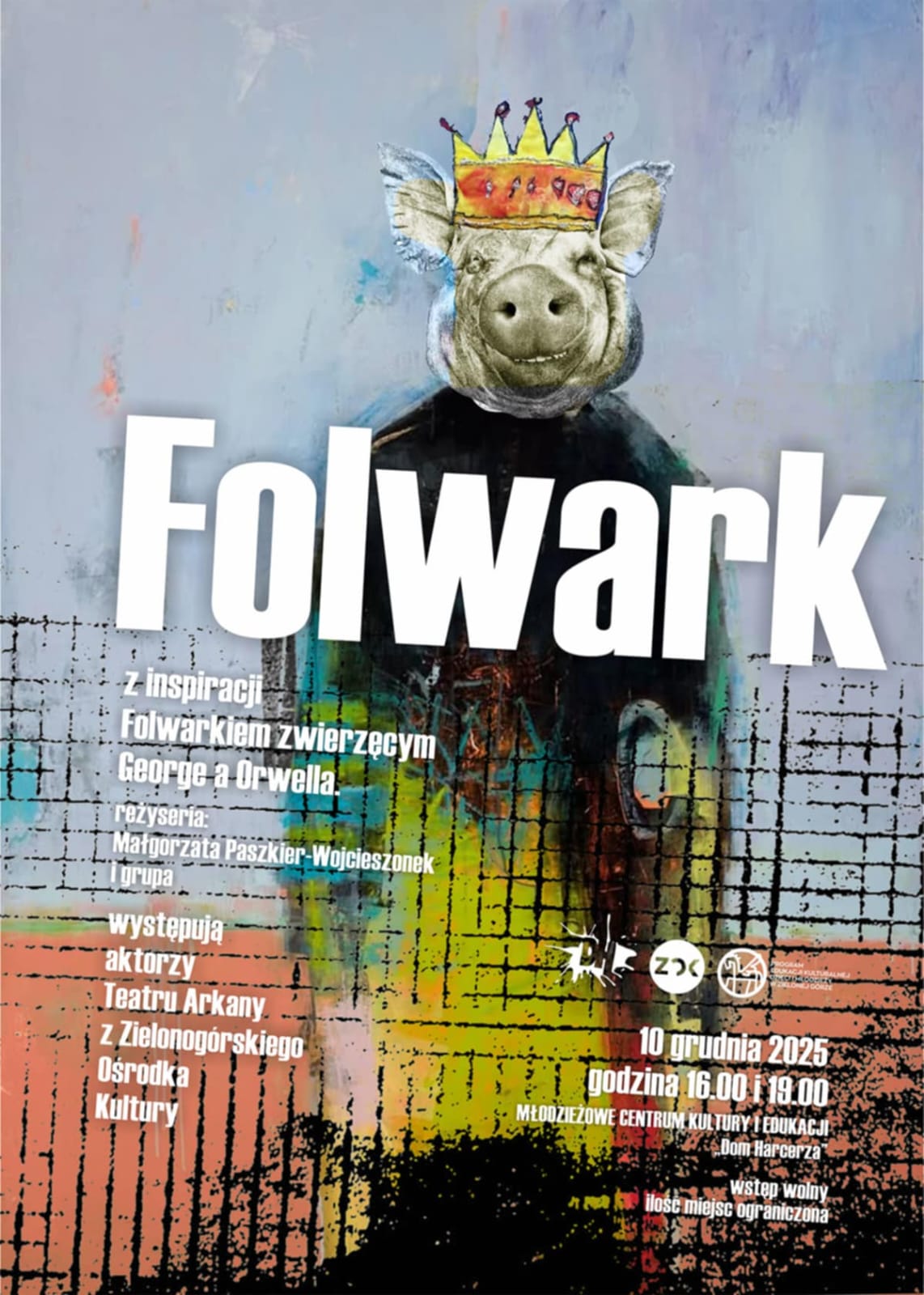 Zapraszamy na spektakl „FOLWARK”, inspirowany „Folwarkiem zwierzęcym” George’a Orwella, w wykonaniu aktorów Teatru Arkany działającego przy Zielonogórskim Ośrodku Kultury