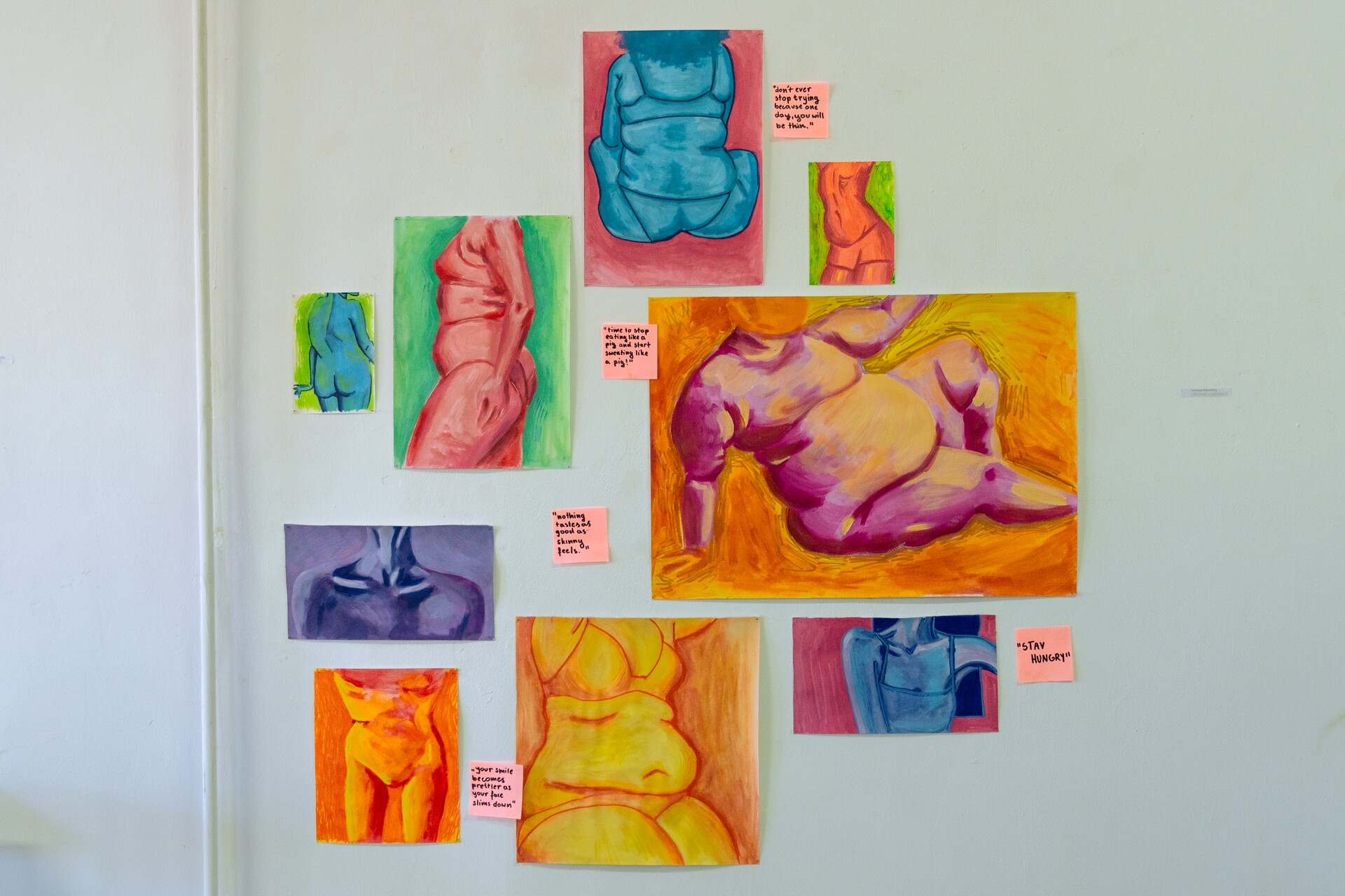Karolina Chojnacka proponuje zestaw masek nawiązujących do wizerunku zespołu muzycznego Slipknot oraz instalację „It’s not about them”, stanowiącą osobisty komentarz i rozliczenie z okresem szkolnym oraz koleżeńskimi, a także rodzinnymi relacjami. Julita Dąbrowska splata w wielobarwnym rysunku refleksje nad dominującymi w jej życiu rolami. To wielogłos matki/artystki i jej dzieci. Nataliia Gryniaieva powraca w obiekcie – przeskalowanej laurce – do swojego dzieciństwa i bezpiecznego kręgu rodziny. Orestes Karkut pokazuje wideoperformans „List”, opowiadający o trudnej relacji ze sobą. Katarzyna Krzysztofik prezentuje wiwisekcyjne obiekty „Obsesje” oraz książkę artystyczną – zestaw interaktywnych ilustracji/makabresek. Alicja Leśków wypowiada się językiem graffiti i komiksu, interpretując utwór „All Caps”. Angelika Matijczak, sięgając do filmu „Dzień świra”, adaptuje autorefleksyjnie zagadnienie rutyny i natręctw, jako elementu codzienności.