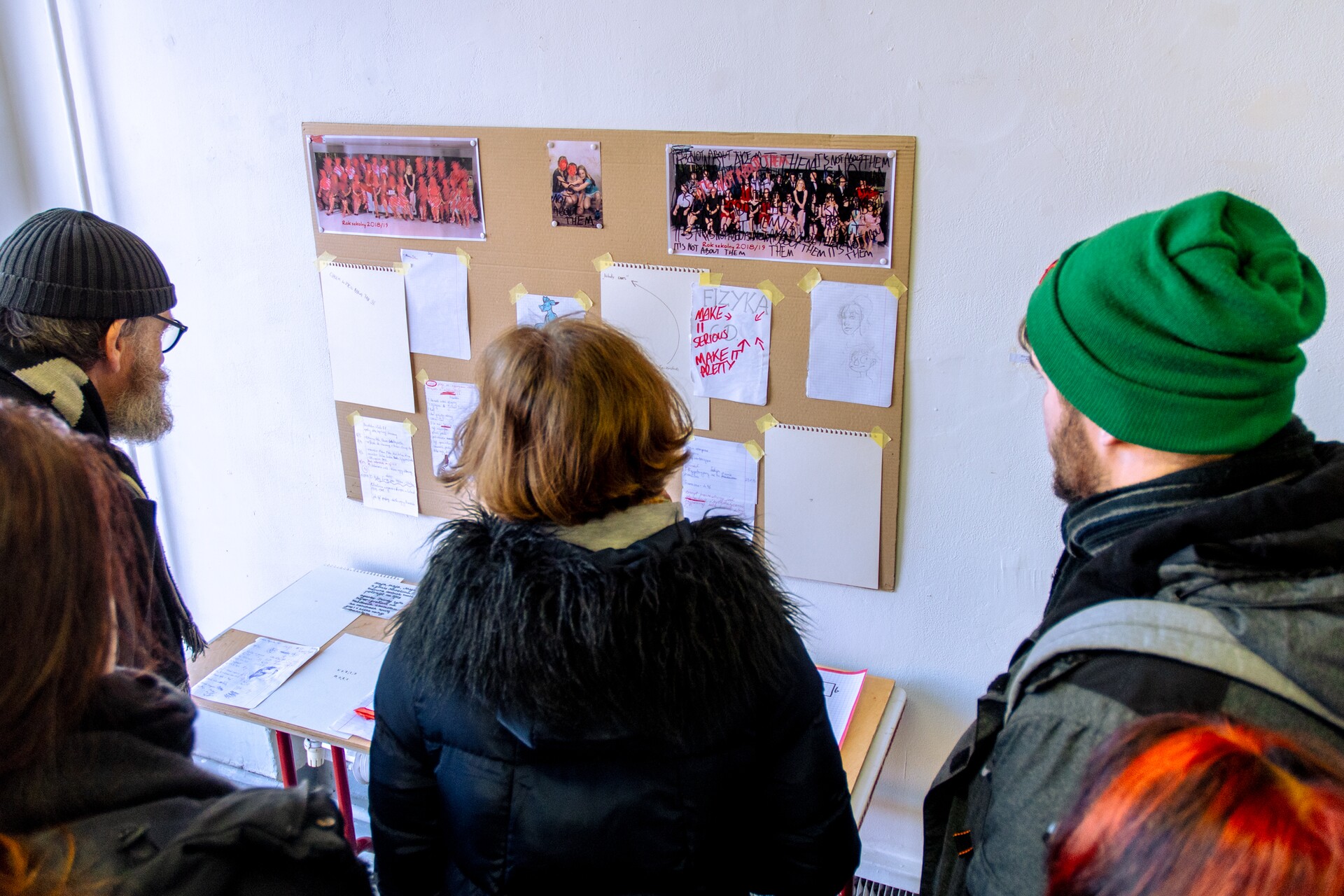 Dominik Rogacki interpretuje w ćwiczeniach – autoportretach rysowanych lewą i prawą ręką – postrzeganie siebie. Ismena Sobańska, przeglądając wpisy w mediach społecznościowych komentujące kobiece ciała, przygotowała realizację „Opowieść o motylach”. Druga praca, to instalacja na temat własnego wizerunku. Aleksandra Szczerbanowicz prezentuje własną wersję klipu zainspirowaną twórczością Wowaki. Bogna Tomiak w cyklu rysunków „I’m your man”, kreśli opowieść o relacji człowieka i psa. Nadia Zawadzka w pracy „Tkanki”, wprowadza nas do mikroświata organizmów, łącząc ich obrazy we wspólną strukturę. Magdalena Zielińska, w migotliwych, złożonych obrazach ‘błędów’, przesunięć i nawarstwień – odnosi się do realizacji tworzonych w przestrzeni Hermicraft.