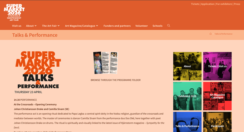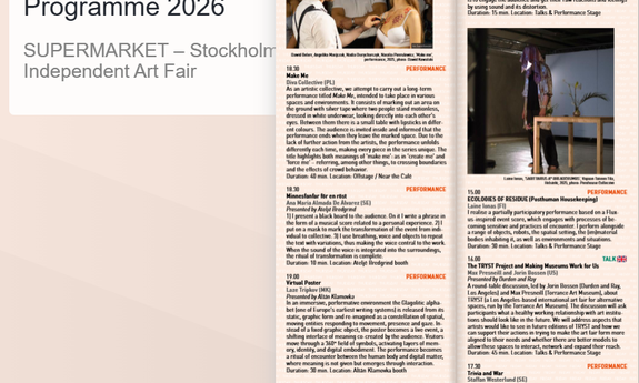 Wydarzenie odbędzie się w dniach 23-26 kwietnia 2026 w Slakthusområdet / Erskinehuset w Sztokholmie. SUPERMARKET to międzynarodowe wydarzenie poświęcone niezależnej scenie artystycznej, prezentujące artist-run initiatives, performans, wystawy i program dyskusyjny.