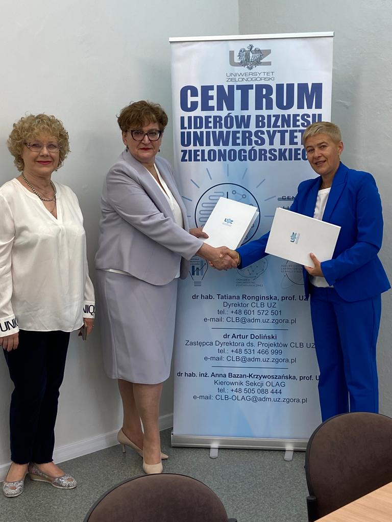 mgr Małgorzata Ragiel - Dyrektor Centrum Kształcenia Zawodowego i Ustawicznego nr 1 „Budowlanka” w Zielonej Górze, dr hab. inż. Maria Mrówczyńska, prof. UZ - Prorektor ds. Współpracy z Gospodarką oraz dr hab. Tatiana Ronginska, prof. UZ - Dyrektor Centrum Liderów Biznesu UZ